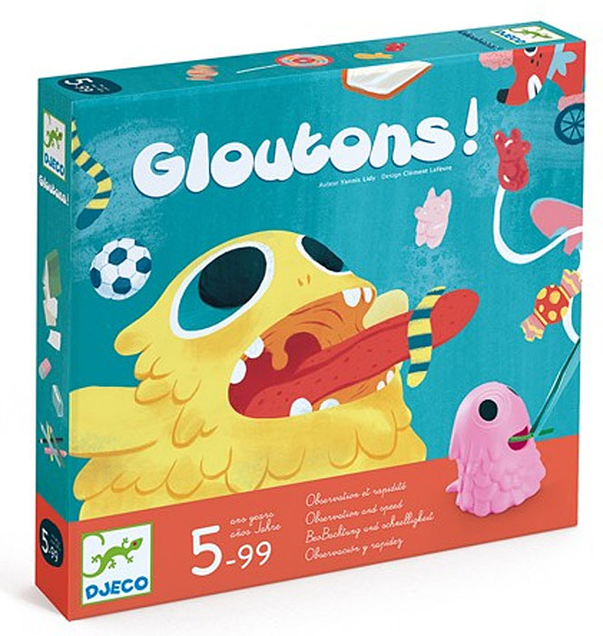 gagner un maximum de cartes « objectif ». Chaque joueur prend un monstre et une pince qu’il pose devant lui. Les cordelettes sont au centre de la table et accessibles à tous. Un joueur retourne une carte. Tous en même temps, les joueurs doivent attraper, avec leur pince, les objets indiqués sur la carte et les glisser dans la bouche de leur monstre. Dès qu’un joueur pense avoir terminé il crie « Glouton » et le jeu s’arrête. On vérifie s’il n’a pas fait d’erreur en soulevant son monstre : si c’est correct : le joueur gagne la carte et la pose devant lui. S’il a fait une erreur : le tour de jeu s’arrête pour lui et la partie reprend pour les autres joueurs jusqu’à ce qu’un autre joueur crie « Glouton ». |