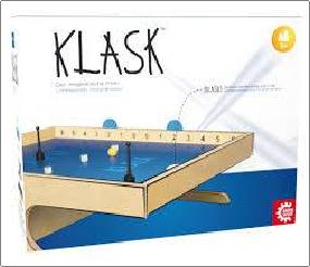 1 plateau de jeu Klask 2 pions magnétiques 2 aimants de pilotage 3 aimants blancs (+1 aimant de rechange) 2 jetons de score 1 bille (+1 bille de rechange) 1 sac pour ranger les pièces 1 règle de jeu |