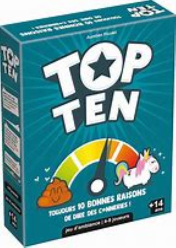 Top Ten ! Un jeu d'ambiance coopératif délirant et innovant ! Répondez tous à l’un des thèmes (drôles ou étonnants) en fonction de votre numéro (entre 1 et 10). Ensuite, l’un de vous tente de remettre toutes ces réponses dans le bon ordre pour faire gagner l’équipe ! Lisez un thème. Exemple : Quel objet fallait-il avoir lors du naufrage du Titanic ? du moins utile au plus utile. Chacun invente et annonce une réponse correspondant à son n° secret de 1 (le moins utile) à 10 (le plus utile) :« Une bouée canard » « Un jet-ski » « Une machine à remonter le temps » « Un appareil à raclette »… Si le Cap’ten arrive à remettre les réponses dans le bon l’ordre, du plus petit au plus grand n°, l’équipe a gagné ! 500 thèmes variés et délirants qui vous feront inventer, raconter et mimer n’importe quoi ! Enfin un jeu où la surenchère de c*nneries est payante ! |